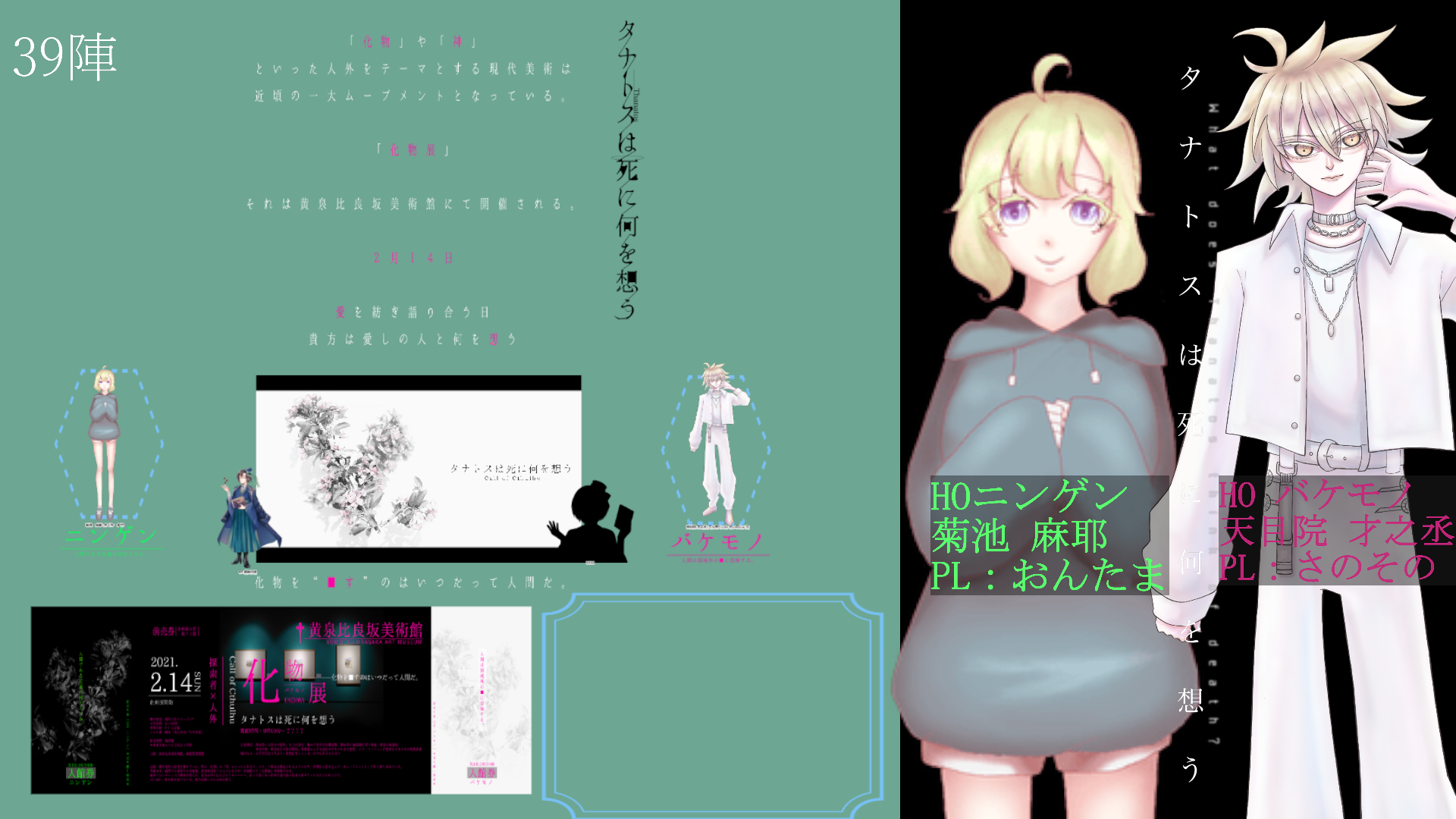 26 2025.10 【CoC】「タナトスは死に何を想う」卓報告 CoC「タナトスは死に何を想う」 KP:ゆうりさん PC / PL HO:ニンゲン 菊池 麻耶 / おんたまさん HO:バケモノ 天目院 才之丞 / さのその END:Hにて終幕。 へへ。ありがとうございました!