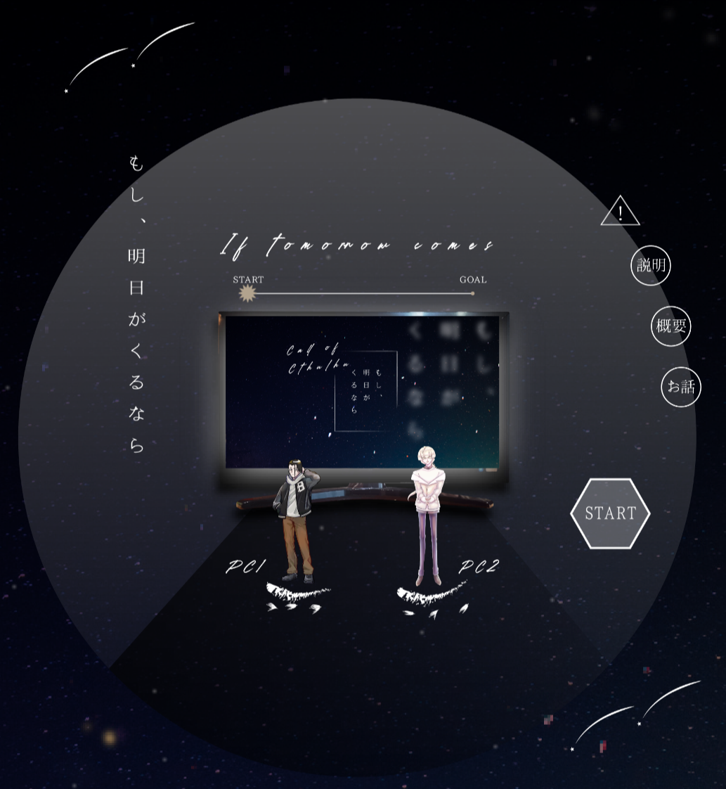 22 2026.1 【CoC】「もし、明日がくるなら」卓報告 CoC「もし、明日がくるなら」 PC / PL: 縞江田 丈吉 / ターザン西洋さん 燕 瑳千 / さのその ござ現コバ継続で!色んなじょうさちが見れました…… ありがとうございました!